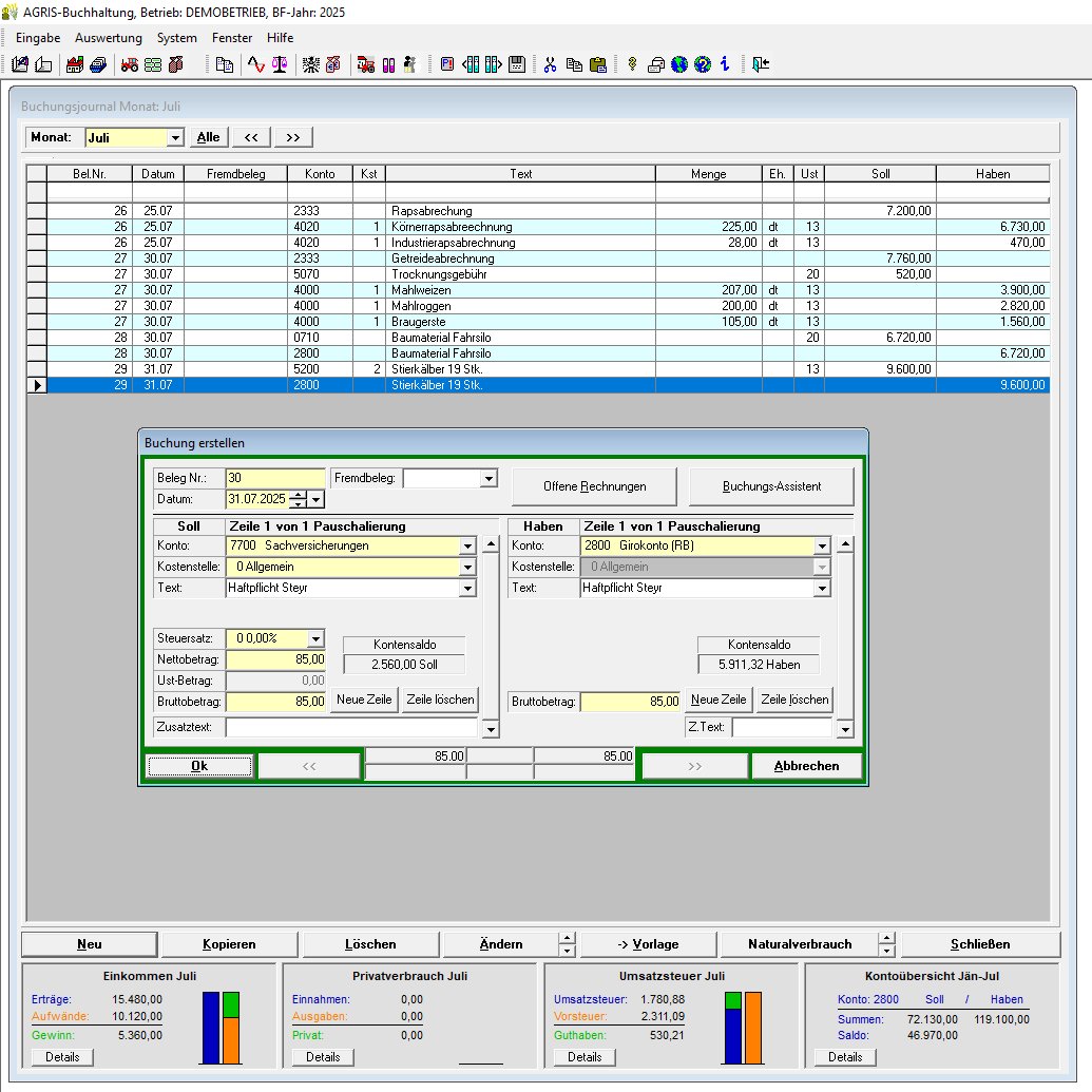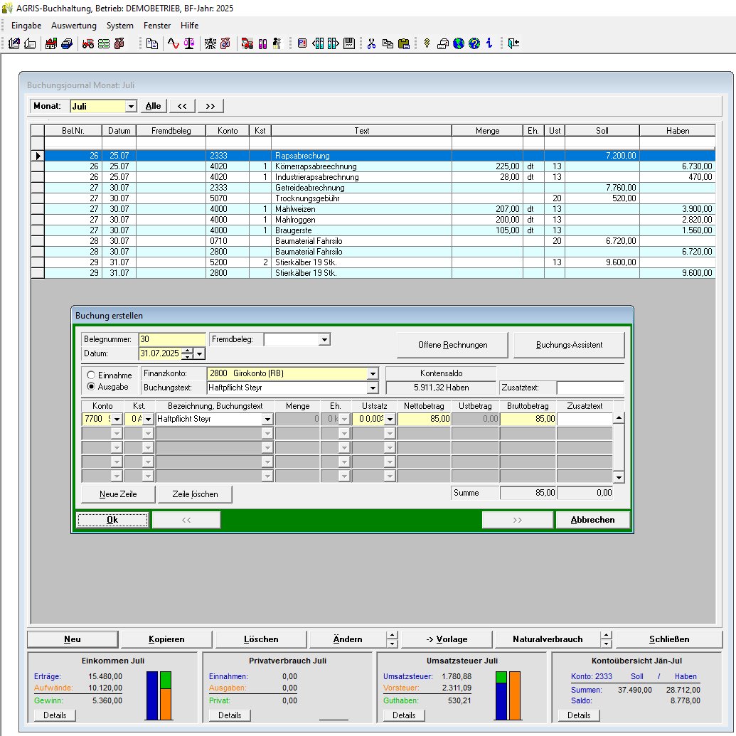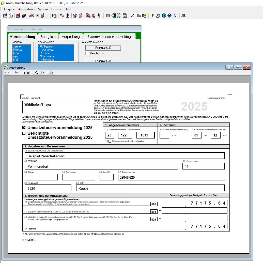 Ihre Aufzeichnungspflichten bei Teilpauschalierung, Option oder Buchführungspflicht können Sie mit dem AGRIS Buchhaltungsprogramm leicht selbst erledigen. Erstellen Sie wenn nötig Ihre Umsatzsteuervoranmeldungen auf Papier oder Online. Am Jahresende können Sie Ihrem Steuerberater die Daten digital zur Verfügung stellen.