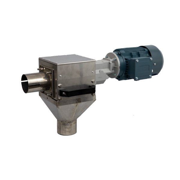 Die Beschickung erfolgt über einen kleinen Einlauftrichter, der direkt mit Silos oder Behältern verbunden werden kann.