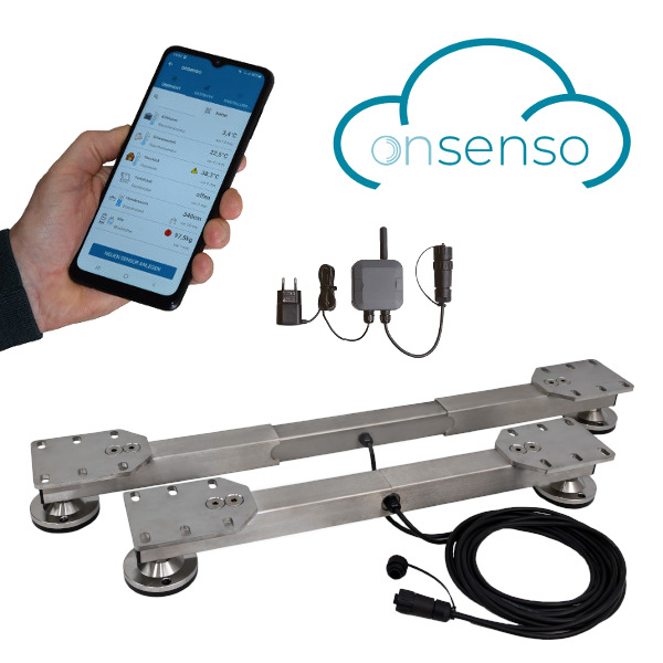 2 Wiegebalken aus Edelstahl • 4.000 kg Wiegebereich, 0,5 kg Auflösung • Balkenlänge stufenlos verstellbar zwischen 734 und 1.043 mm Außenlänge • Einfache und schnelle Montage unter alle Arten von Aufbauten durch variable Lochabstände • Montagemaße zwischen 480 und 990 mm stufenlos wählbar • wasserdicht nach Schutzklasse IP68 • 4m lange Anschlusskabel • Ideal für die universelle Verwendung, auch in anspruchsvollen Umgebungen • zur Einbindung in das Onsenso System zur Online Gewichtsauswertung