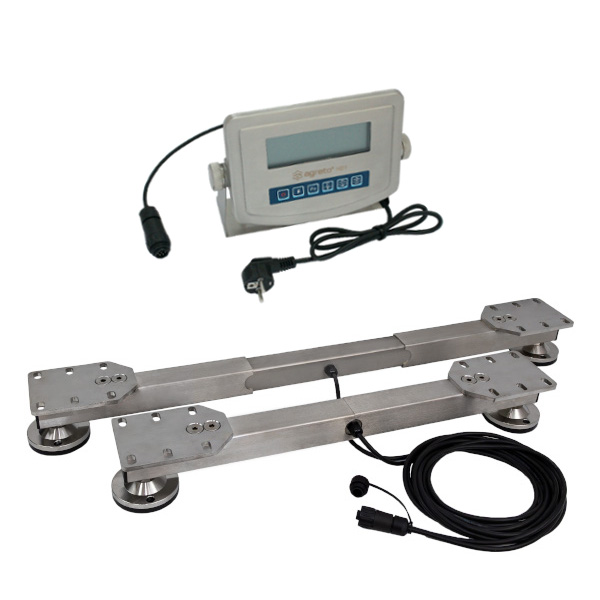 2 Wiegebalken aus Edelstahl • 4.000 kg Wiegebereich • Balkenlänge stufenlos verstellbar zwischen 734 und 1.043 mm Außenlänge • Einfache und schnelle Montage unter alle Arten von Aufbauten durch variable Lochabstände • Montagemaße zwischen 480 und 990 mm stufenlos wählbar • wasserdicht nach Schutzklasse IP68 • 4m lange Anschlusskabel • Ideal für die universelle Verwendung, auch in anspruchsvollen Umgebungen • Wiegeanzeige aus Edelstahl HD1
