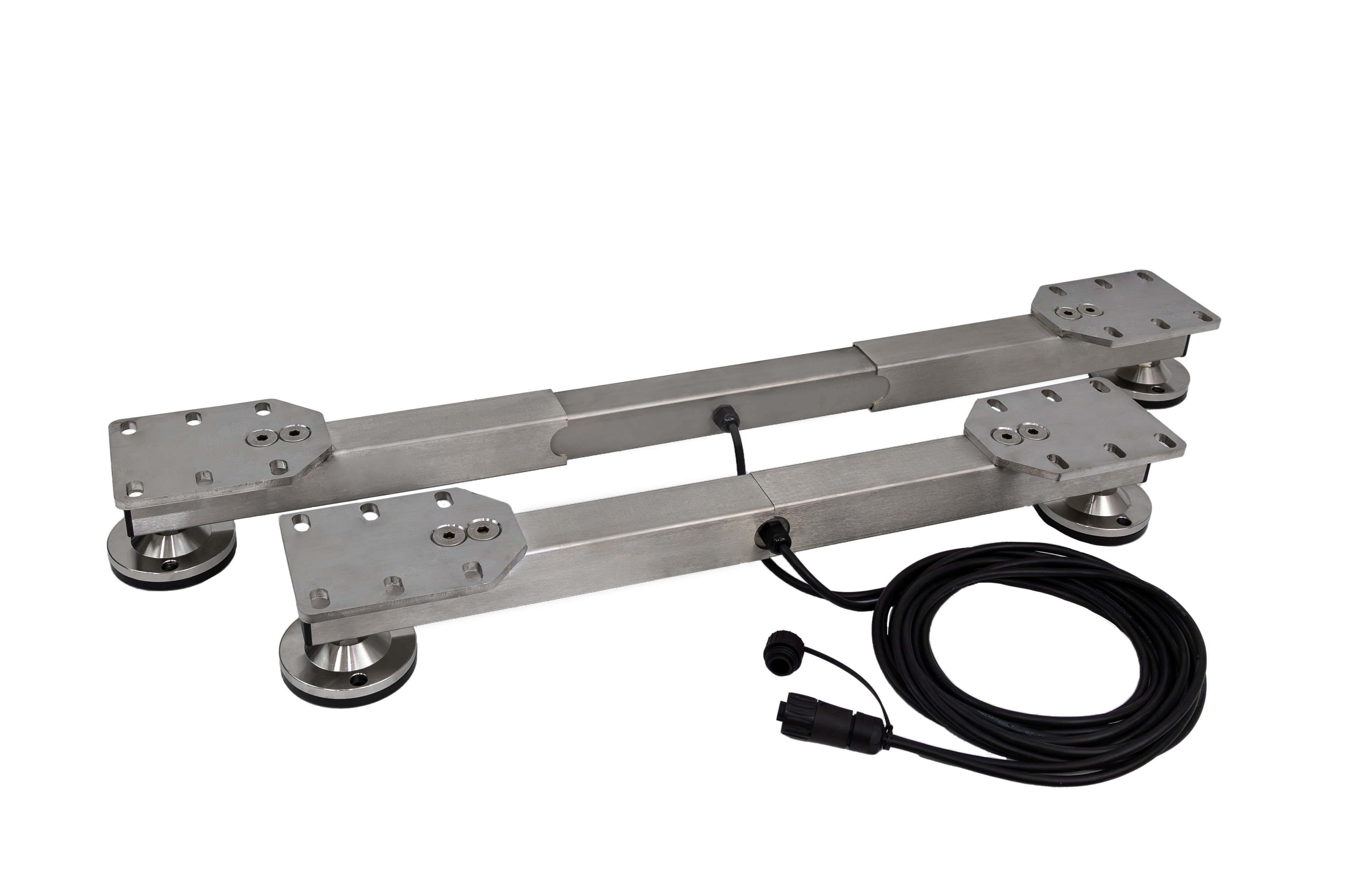 2 Wiegebalken aus Edelstahl • 4.000 kg Wiegebereich • Balkenlänge stufenlos verstellbar zwischen 734 und 1.043 mm Außenlänge • Einfache und schnelle Montage unter alle Arten von Aufbauten durch variable Lochabstände • Montagemaße zwischen 480 und 990 mm stufenlos wählbar • wasserdicht nach Schutzklasse IP68 • 4m lange Anschlusskabel • Ideal für die universelle Verwendung, auch in anspruchsvollen Umgebungen • mit Standardwiegeanzeige XK4
